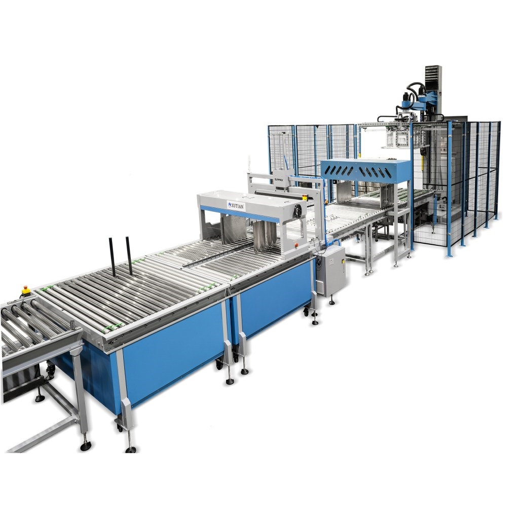 골판지 박스를 자동으로 정렬하고 밴딩하는 통합 시스템입니다.